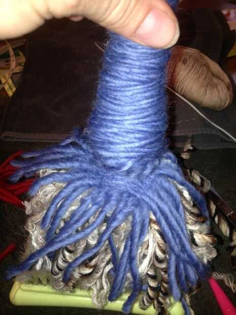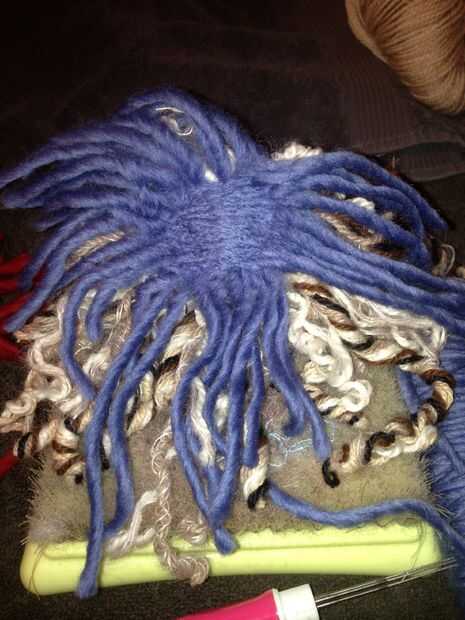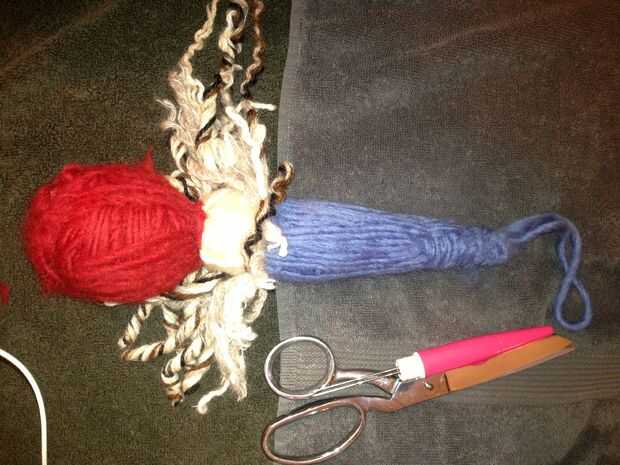 Corte tiras de hilo del mismo color que el sombrero. Los sentía muy firmemente a la parte superior de la cabeza. Coloque el sombrero en la cabeza y alisar las tiras de hilo sobre el sombrero de fieltro el sombrero muy bien.