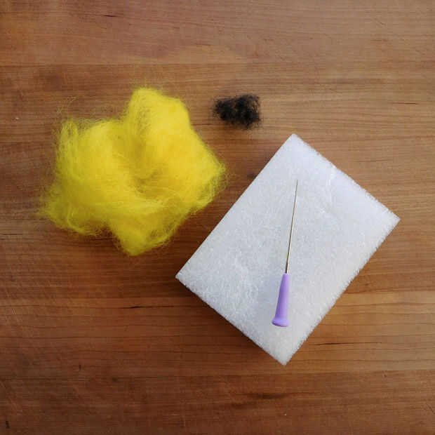 Para hacer un Pío necesita: una aguja de fieltrar, un cubo de espuma y lana amarilla y negra. La aguja tiene dientes para mantener la lana juntos.