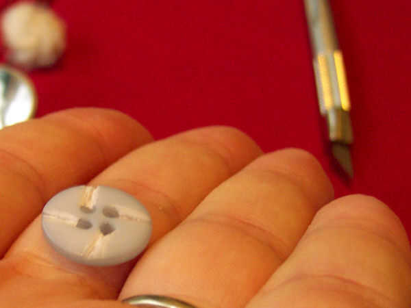 De la muesca el botón como se muestra a continuación con la cuchilla o exacto. Las muescas deben ser lo suficientemente profundas para permitir que el gancho de la aguja para reposo y evitar que la aguja gire.