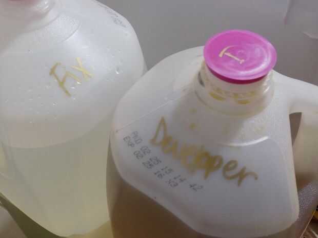 He comprado productos químicos en polvo. Estos deben mezclarse en un área bien ventilada. Cada uno necesita ser mezclado con un galón de agua, así que compré dos galones de agua destilada, vierte algunos de un tazón de fuente para permitir el desplazamiento y la mezcla. Una vez que los químicos se vierten en las jarras, etiquetarlos y agitar para mezclar. Tenga cuidado de mantener la tapa agitando. Cuando la mayoría de la sustancia se disuelve, vierta agua en la jarra hasta que esté lleno y agitar hasta que se disuelva completamente.