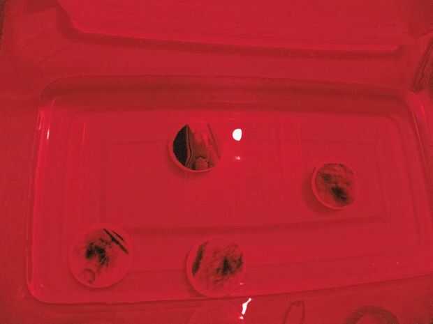 Utilice tenazas para tirar el papel del desarrollador. Mantenga sobre la bandeja y dejar escurrir antes de pasar al baño de paro (agua) durante 30 segundos. Agitar la cubeta.