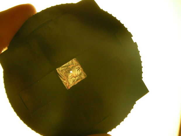 Centro de la lámina sobre el agujero en el centro de la tapa y presiona los dos juntos. Ahora utilice un alfiler para pinchar una pequeña bodega en el centro de la hoja.