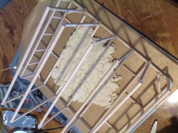 Mezclar algunos arcilla pasta de sal. Dos tazas de harina, dos tazas de agua, algo de sal... no se moleste en leer la receta totalmente. Con sólo pasar su marco de edificio sobre una bandeja para hornear con papel encerado. Volcar la mezcla pegajosa sobre la bandeja. Daremos vuelta bien (lo suficiente), no te preocupes.