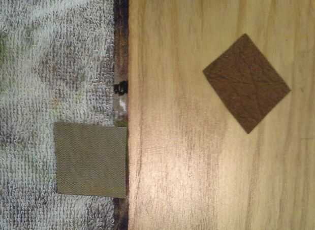 Usted puede mostrar u ocultar el material de refuerzo. Decidí mostrar el cuero del faux del lado estampado de la toalla. Lo que necesita saber es que empieces por ver la parte posterior de su material de refuerzo y la parte de su material más grande que no se verá. Por ejemplo: en la imagen asociada, se ve la parte de atrás de la toalla y la parte posterior del cuero del faux se ve así. Cuando termine el agujero, la piel se verá en la parte delantera de la toalla. Si fueras a querer en la parte posterior de la toalla, la piel sintética sería iniciado cara abajo en la parte delantera de la toalla.