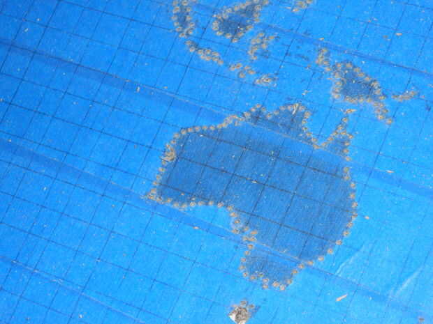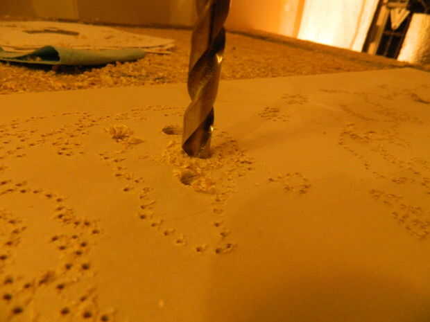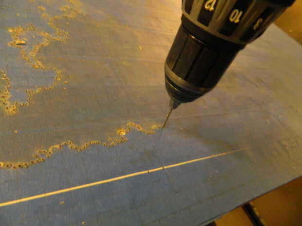 Todas las tierras serán perforadas hacia fuera, y los océanos, ríos, lagos etc. se quedará solo. El patrón que usé es una perforación precisa de un contorno (con una broca de 5/64), para el resto de la tierra masa taladré agujeros de tamaños diferentes al azar.