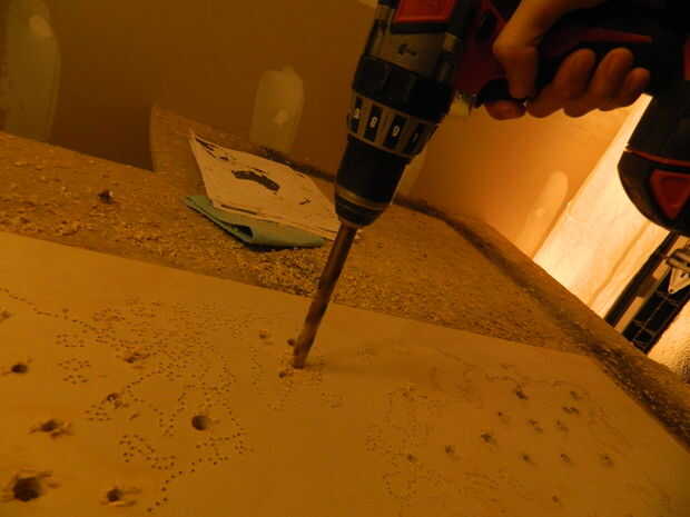 El trazado marcado, asegurándose de dejar algo de espacio entre los agujeros de taladro. Una vez finalizado quitar la cinta y la página.