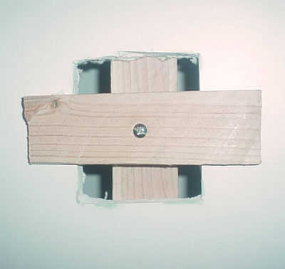 Ahora, con el tornillo sosteniendo ambas piezas de madera, deslice la parte inferior en el orificio y céntrela. Tomar la pieza superior de la madera y gírelo 90 grados a la orientación de la pieza que está dentro de la pared. Atornillar el tornillo hasta que la pieza superior de madera resto contra la pared y tiene las dos piezas de madera en el lugar en el centro del agujero.