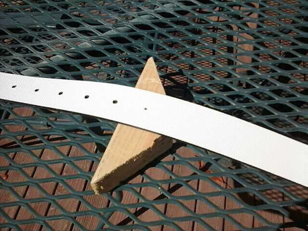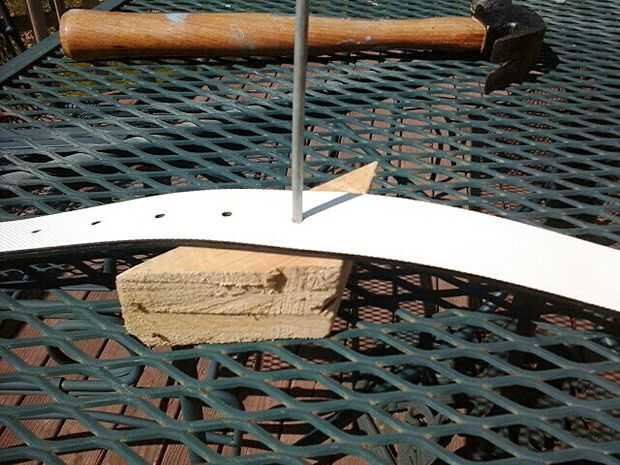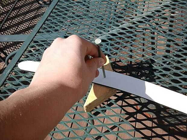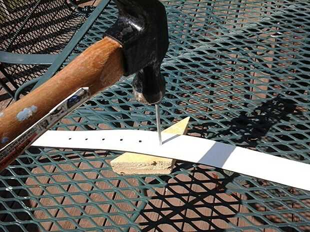 para crear el orificio toma el clavo y poner en la marca que hizo, luego tomar la su pedazo de madera para martillo el clavo a través de la correa.