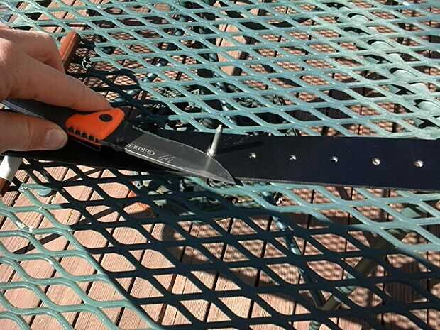 Ahora que han hecho el agujero se puede limpiarlo tomando un cuchillo y cortar el cuero de exceso que el clavo impulsó, después de haber hecho eso puede círculo la punta de la cuchilla alrededor en el agujero para suavizar los bordes