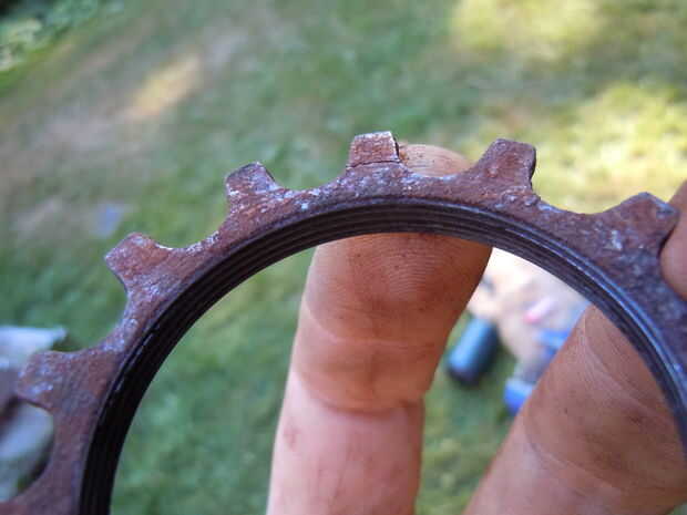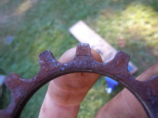 Epílogo: Hubo un par de dientes agrietados. Esto podría haber ocurrido cuando martillado después que vierte en el agua. El enfriamiento rápido puede haber hecho el metal frágil. Lo que sea, este tipo de rueda dentada es propenso a dientes rotos...