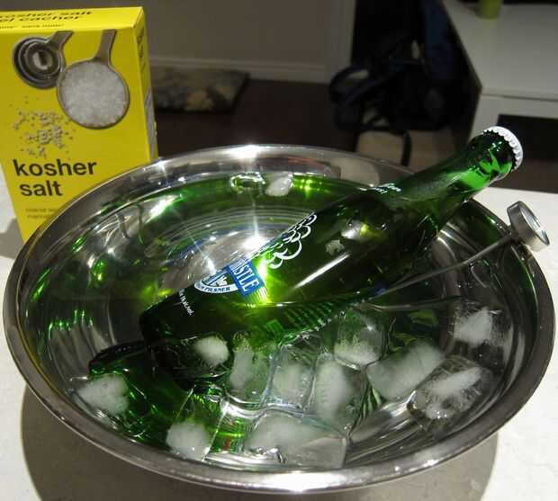 Para un ejemplo práctico. Imagino que algunos amigos llegan inesperadamente y todo lo que es cerveza caliente. Su primer instinto puede ser poner la cerveza en la nevera, pero usted sabe que la tasa de transferencia de calor desde la cerveza al aire nevera sería lento porque la diferencia de temperatura sería solamente cerca de 20 grados. Crees que el congelador sería una mejor idea te da aproximadamente una diferencia de 40 grados. Pero el aire tiene una baja conductividad térmica, piensas. Sería mucho mejor envasar la cerveza en el hielo, que siendo un sólido es mucho más conductora que el aire. Lástima que el hielo está en esos trozos grandes y el área total de contacto será muy pequeño. Afortunadamente usted recuerde que el agua tiene una conductividad térmica decente y decide agua sobre el hielo para ayudar a que el calor viaja de la cerveza caliente en el frío hielo. Ahora tienes un buen conductor térmico en contacto con su cerveza sobre un área grande y una diferencia de temperatura grande entre la cerveza y el hielo. Crees que es realmente una lástima que el agua no se puede obtener cualquier temperatura inferior a 0° C hasta que recuerdas que sólo el agua pura no se puede obtener temperatura inferior a 0°. Llegar a la sal, sabiendo que tú y tus amigos podrá disfrutar de cerveza fría en ningún momento.
