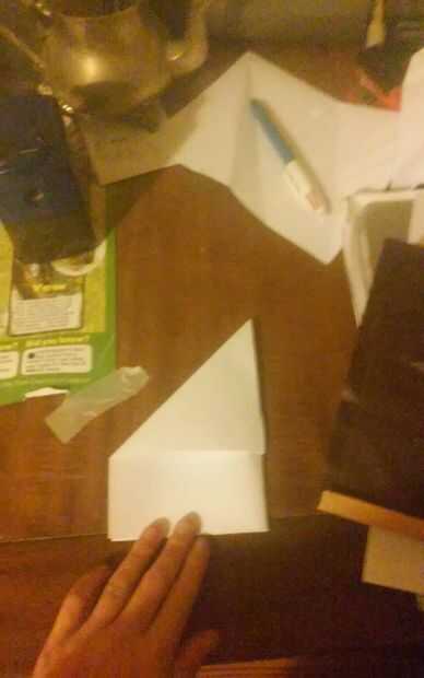 este aeroplano de papel es mi interperation de la superficie de sustentación de Kline/Fogleman. ? ¿Qué es eso? pregunte. Es un diseño de superficie de sustentación que incorpora un "paso" en el ala, que parece hacer un avión volar más suaves y c