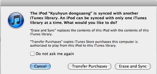 Una vez iPod B está conectado a iTunes, aparece un cuadro de diálogo de advertencia cuando se selecciona A) iTunes se conecte automáticamente y sincronizar o B) Seleccione Sync por primera vez para iPod B.