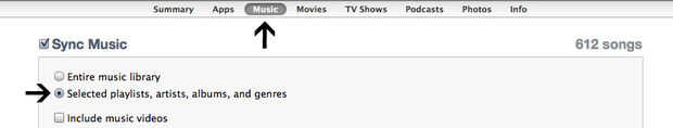 Selecciona tu iPod en el menú dispositivos y seleccione la música en el iPod Resumen. Hay unas cuantas opciones más que deben seleccionarse, pero esto es también una vez que paso por cada iPod sincronizado con esta biblioteca.