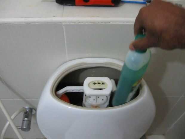Si es posible llenar la botella con agua destilada con cualquier anti fungicida desinfectante como Lizol o Dettol (marcas populares en la India). Coloque con cuidado esta botella dentro del tanque, con un inquietante el mecanismo del flotador.