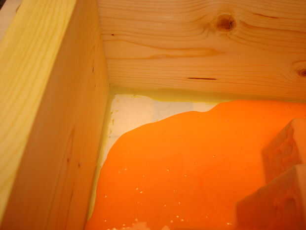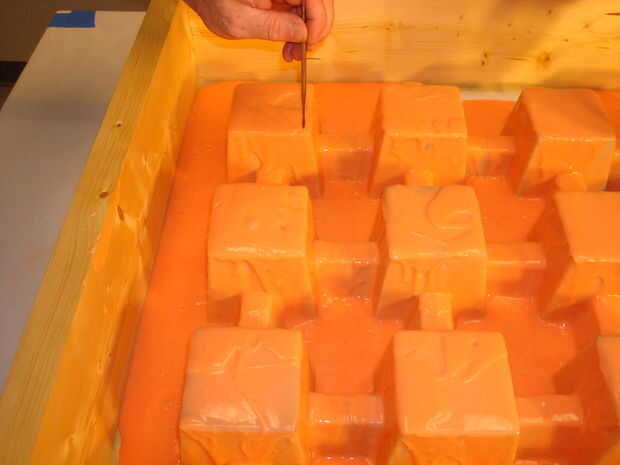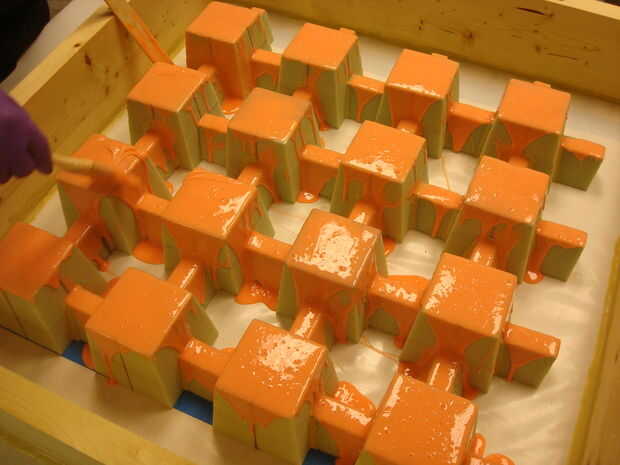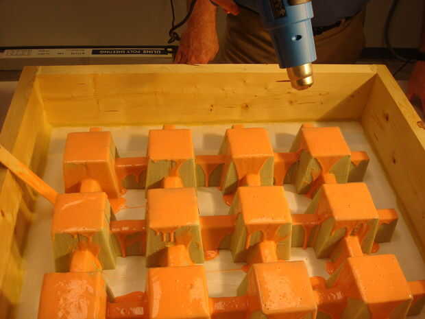 Una vez que tengas una buena mezcla, vierta la silicona sobre la parte superior de los bloques y continuar con un cepillo de cerdas. Encender luces de trabajo para proporcionar calor ayudará la silicona ejecutar pero con también acelerar el tiempo de fraguado (es decir, reducirá el tiempo de vida útil). Usted puede conseguir el mismo efecto con una pistola de calor. Tenga cuidado de no quemar la silicona. Usando la pistola de calor también provocará burbujas más pequeñas en la silicona al pop.