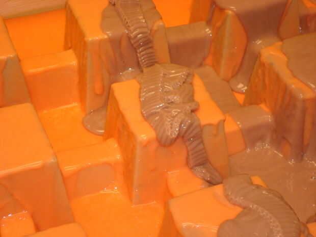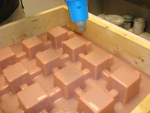Una vez que la silicona se mezcla uniformemente, viértala sobre el modelo. Derramé la silicona de altura con el fin de quitar todo el aire de ella como sea posible. Verter de una altura como esta reduce el número de burbujas de aire mucho. De nuevo, utilice un cepillo de cerdas para difundir la silicona hacia fuera. Utilice la pistola de calor otra vez para que la silicona más fácil difundir y eliminar burbujas de aire.