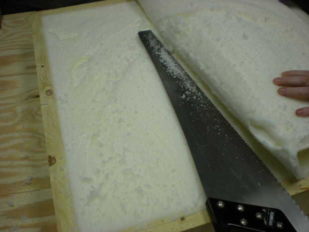 Mezcle las partes A y B de la espuma según lo recomendado por el fabricante. Observar la vida de pote y este material tiende a reaccionar con rapidez. Asegúrese de hacer un cálculo aproximado para el volumen como la espuma se expande. La espuma usé ampliado 10 veces su cantidad original. Verter la espuma en el molde. Intente verter lo más uniformemente en el molde como sea posible para evitar tener zonas muy gruesas y muy finas. Desea la espuma expandirse tan uniformemente como sea posible a través de la superficie del molde entero. No te preocupes si él sobre flujos de la estructura, que desea por encima de la altura del marco.