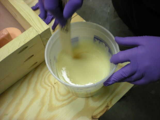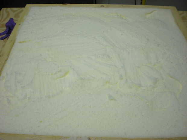 Asegúrese de liberar su molde de silicona y los lados del marco con la mezcla de jabón y alcohol de la alegría. De lo contrario se convertirá en la espuma y su molde uno. Ir sobre el molde y los lados varias veces para asegurar una cobertura completa. Deje que el alcohol de flash apagado. Puede acelerar esto con luces de trabajo o una pistola de calor.