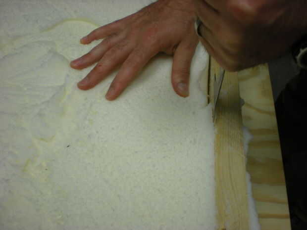 Una vez que haya curado la espuma, corte el exceso en la parte superior con Sierra de mano de carpintero largo. Recorte las áreas irregulares posterior con una mano Japon vieron (porque tiene una hoja muy flexible) e incluso hacia fuera tanto como sea posible. Una vez tienes como incluso como posibilidad de utilizar la herramienta 3 en 1 para empezar a aflojar los lados de la madera. Tenga cuidado de no aplastar la espuma presionando hacia abajo en él demasiado.