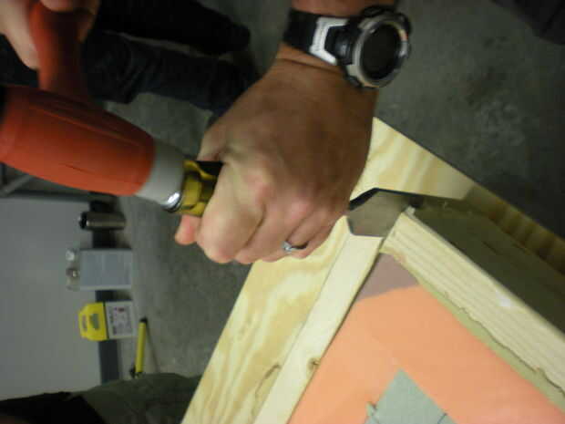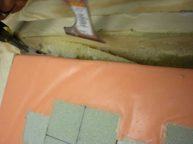 Una vez los lados de la espuma han sido aflojados desde el marco, quite los lados del marco. Esto es donde los agujeros de bolsada de Kreg y los tornillos son particularmente útiles. Utilice un cincel y un martillo a los lados de la parte donde pegamento caliente puede tener el marco juntos. Utilice la herramienta 3 en 1 para aflojar cualquier izquierda sobre espuma aún pegada al marco. No sólo tire o la espuma puede romperse.
