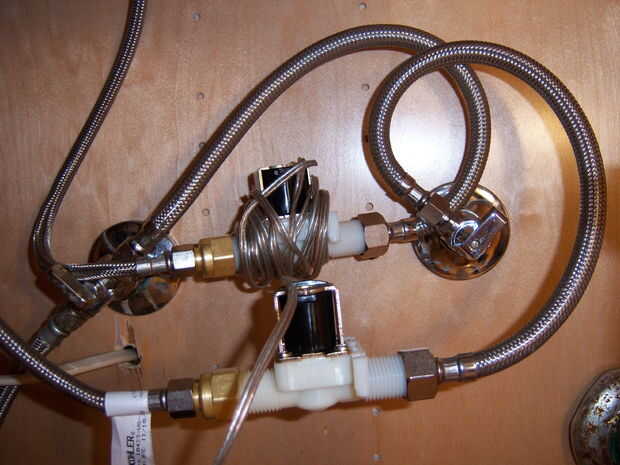 Tome su primer montaje del solenoide y fíjelo a la válvula y el tubo correspondiente. Es aceptable para enrollar las mangueras, siempre y cuando la bobina no está demasiado apretada. Empecé por fijación del conjunto de la manguera a la llave, y luego una vez que estaba seguro, había unido a la válvula. Asegúrese de que usted no retuerza la manguera como se apriete. Repetir para la segunda válvula. Me aseguré de posición mi solenoides "vertical", por lo que si hay pérdidas, no entran en contacto con mis conexiones eléctricas.