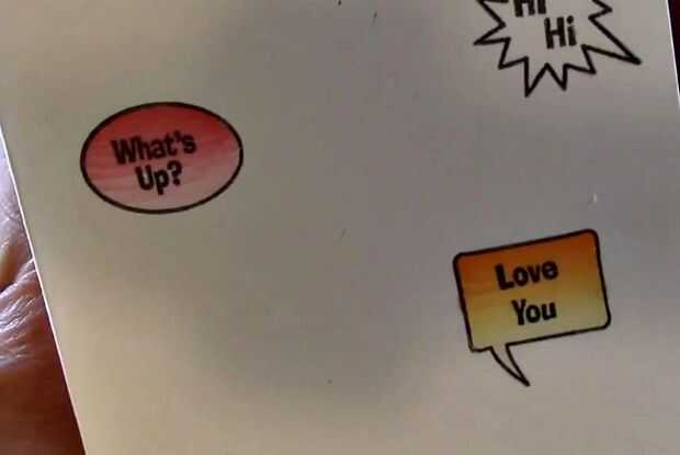 Una vez que han coloreado sus burbujas de discurso después de estampar la imagen y el sentimiento, corte las burbujas del discurso. Les se adhieren con pegamento o con un cuadrado de espuma para la dimensión en su tarjeta. Ponga a un lado.