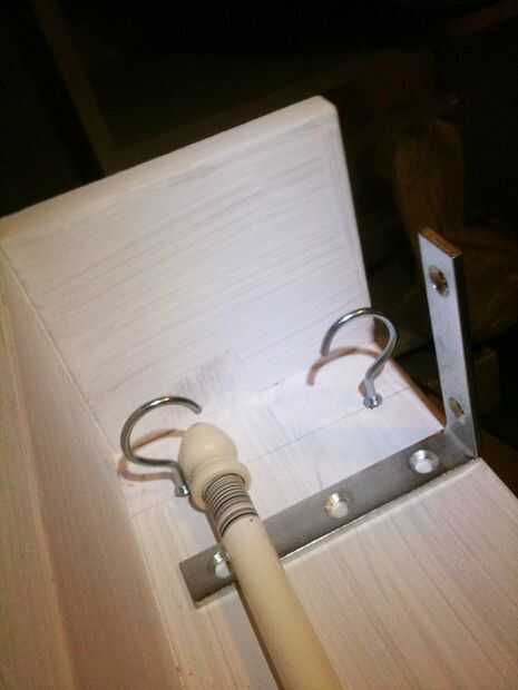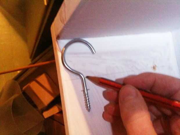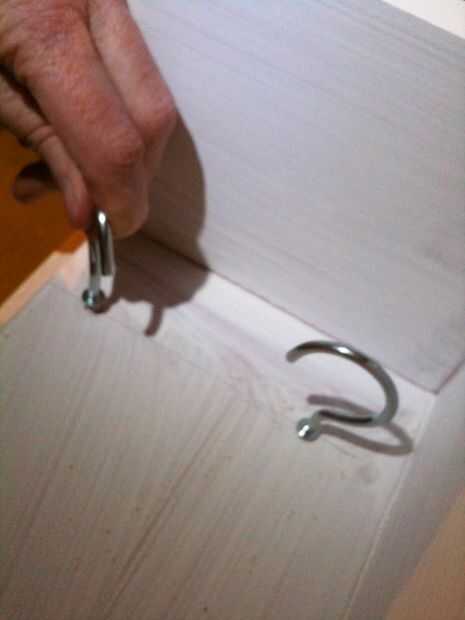 Perfore previamente los orificios con una broca más pequeña que los ganchos de rosca para no salir, pero no dividir la madera va en cualquiera. Mina asomó por el otro lado un milímetro o dos así que rotaba les regreso una vuelta o dos para que la parte superior sería suave para quitar el polvo o como un estante.