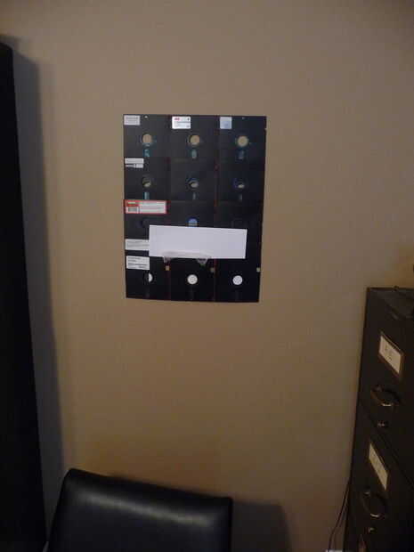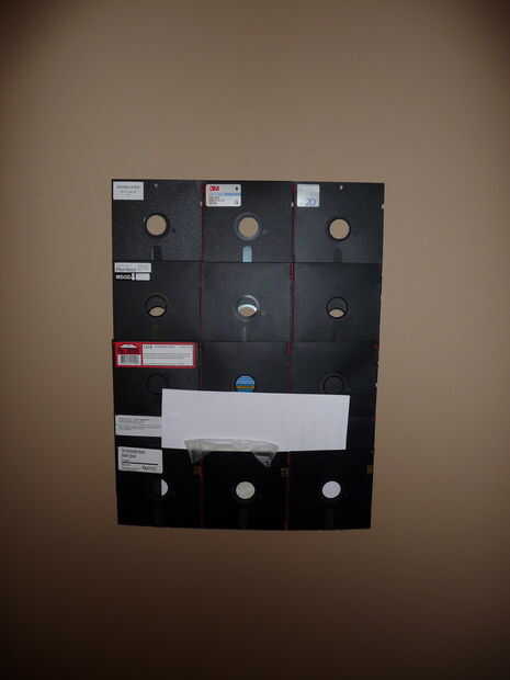 En una puntada zig-zag, un brillante hilo contrastante y una aguja para tela vaquera (la máquina), cosieron 8 filas de disquetes de 3.