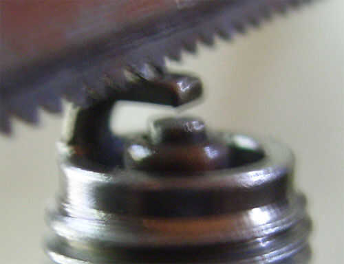 Usando una dremel con un disco de corte o una sierra de arco tendrá que cortar el electrodo de masa con el borde del electrodo de centro. Usted necesita tener cuidado de no golpear el electrodo central o la porcelana.