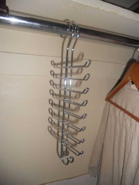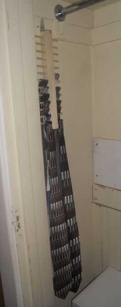 tuve uno de ésos corbateros de metal que cuelgan de una barra de la ropa y para mí, sólo no estaba cortado. Los lazos son difíciles de sacar y tuve que mover un montón de ellas para ver los vínculos debajo. También estaba acabando espacio tie. Así que decidí hacer un corbatero que no sólo me daría más lugares para poner lazos, pero que me ahorraría algo de espacio!