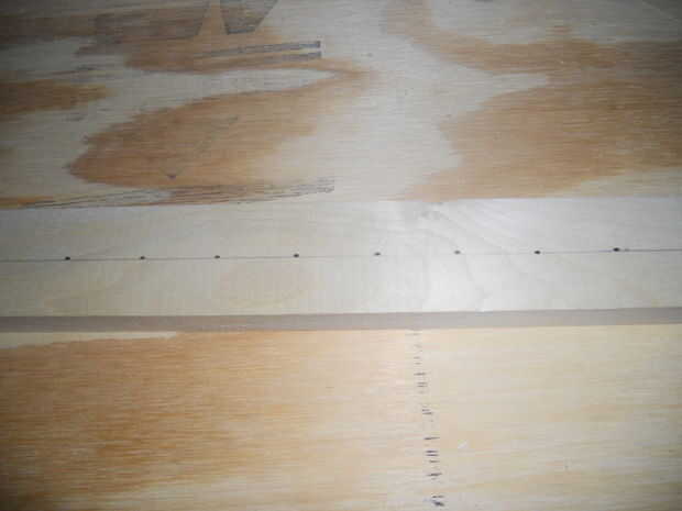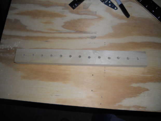A continuación, encontré el midline de la cara 2" y marcados con una línea de lápiz. En esta línea he puesto puntos con un marcador cada pulgada. Con una 1/4 broca, estos puntos serán los agujeros para las clavijas. Un tablero de 14" con orificios cada pulgada equivale a trece agujeros y trece piezas de espiga.