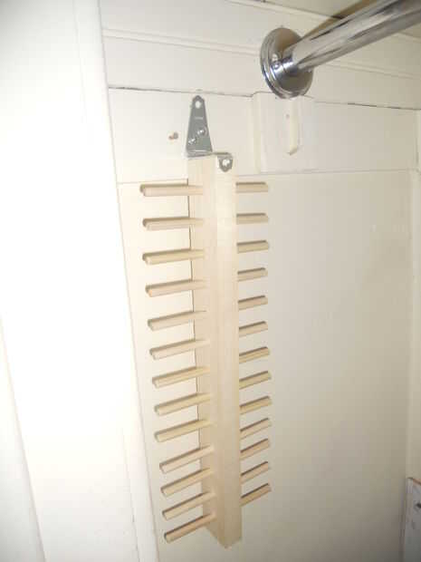Una vez que la rejilla en la pared, puede Agregar vínculos levantando el brazo en una posición perpendicular a la pared y deslizándolos hacia las clavijas. Una vez terminado, deje que el brazo caiga en paralelo para almacenar. Los vínculos son seguros contra la pared y lo suficiente de cada lazo es visible para identificarlo.