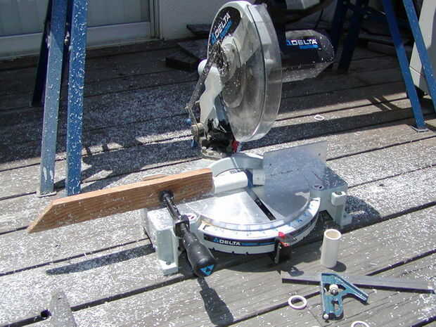 Como se puede ver en la foto, estoy usando un trozo de madera de 1 x 2 como una parada para que conseguir absolutamente uniformes longitudes del tubo de PVC.  Puede utilizar el mismo truco con una caja de ingletes, utilizando una abrazadera en C para mantener el tope en su lugar.
