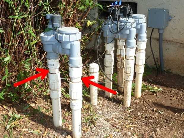 Aquí está el resultado final, unos años más tarde.  Sólo tres de los cinco canales del colector están en uso; sin usar están capped y reservados para uso futuro.  Debe ser necesario reemplazar una de las válvulas, uno sería cortar el tubo de PVC en la sección del adaptador en las esferas indicadas por las flechas rojas, luego Desenrosque y deseche las piezas de deslizamiento x FPT restante encima de las canalizaciones verticales.  También, desenroscar y deseche las piezas de deslizamiento x MPT restante en el cuerpo de la válvula.