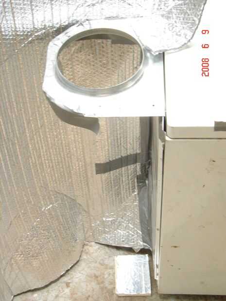 Utiliza un conducto de ventilación del 6 pulgadas diámetro desecho del metal de hoja y había escondido su borde fino entre la secadora y el panel posterior y apretar los tornillos.