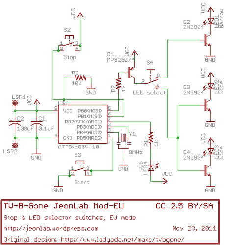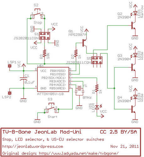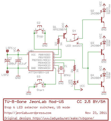 Como se puede ver en el diagrama del circuito, el modelo NA (o nosotros) no tiene ningún resistor de pull-down en el pin 6. Cuando usted con éxito encender o apagar un televisor en el medio de generación de código (la visible LED intermitente), simplemente pulse el botón S2 tirará el pin 6 a tierra y el firmware será detener el proceso y entrar en modo de sueño que no consume la batería.