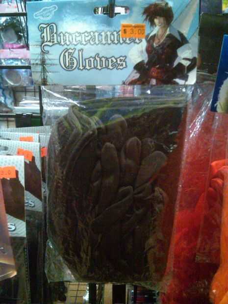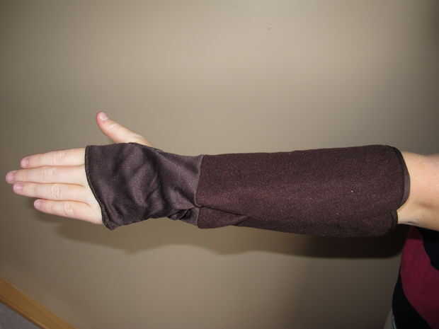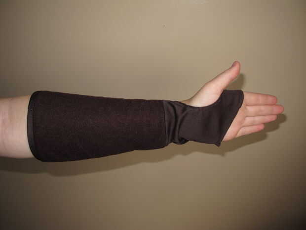 Volver a la tienda de disfraces he encontrado un par de guantes Buccaner por $3. Cosí el extremo ensanchado de los guantes de cierre plegado sobre y coser. No hay corte requerido. Desea que el guante sea apretado en el brazo hasta el final. Para quitar los dedos dibujé una línea en un ángulo, desde justo debajo del nudillo del dedo índice a aproximadamente una pulgada por debajo del nudillo de la pinky. Corte esta línea utilizando unas tijeras afiladas. Tijeras desafiladas sólo arruinará los guantes. Luego dobla a la tela sobre un poco y les cosió para que no exista se deshilache la tela.