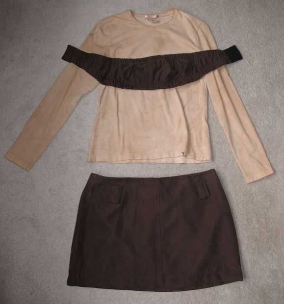 Fui a una tienda y encuentra una camisa de longsleve blanco liso y una falda de longitud marrón de tobillo para cerca de $12. No pude encontrar una falda corta marrón que era lo que andaba buscando, pero la falda de largo tenía la ventaja de material extra.