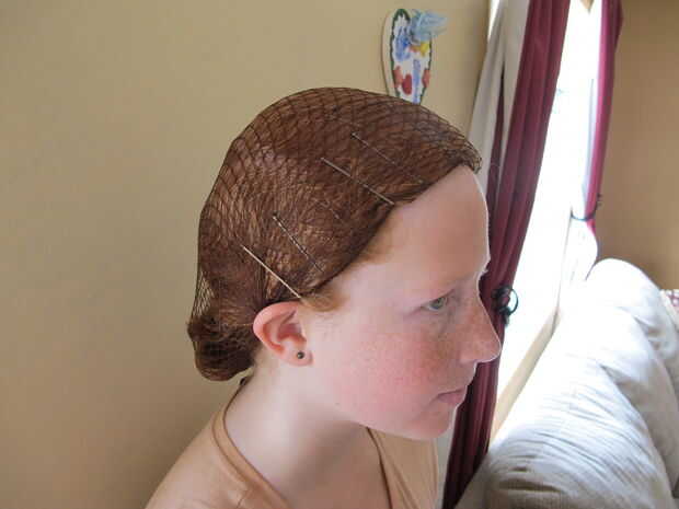 Comience con una redecilla. Hace la tapa del calva mucho más fácil. Porque mi hijas el pelo es grueso tomó bastantes horquillas para conseguirlo todos pegados abajo. Poco de laca para el cabello también se utilizó para obtener el cabello fino a quedarse abajo.