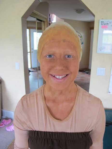 Poner la baldcap en y la goma de espíritu para pegarlo hacia abajo. Luego aplica el maquillaje bronceado / cobrizo a toda la cara, cuello, parte posterior de las manos y la baldcap. Una vez hecho esto usted puede poner el casco.