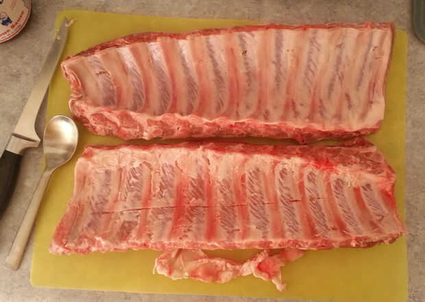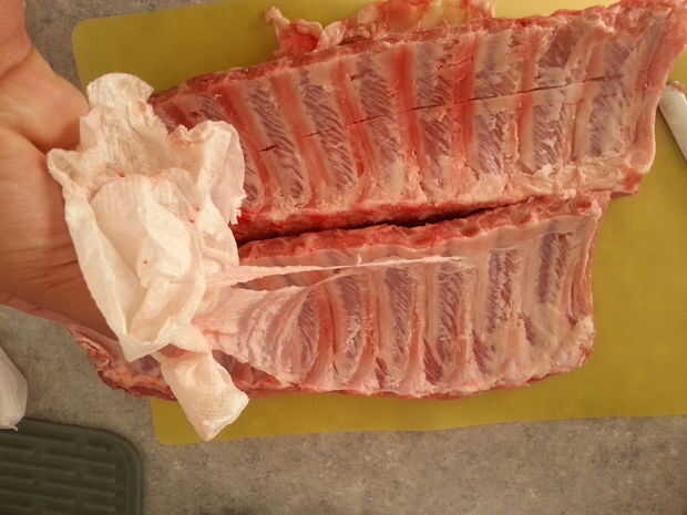 Primero preparar las tablas de las costillas. Las costillas contienen una membrana en la parte de hueso que hay que eliminar antes de cocinarla. Si la izquierda en la bloquear la frotación penetre en la carne y tienen una textura no tan agradable al consumo. Para quitar, inserte una cuchara entre dos huesos, justo debajo de la membrana y jalelo para sacarlo un poco de la esquina. Luego coge la esquina con una toalla de papel y tire fuerte!