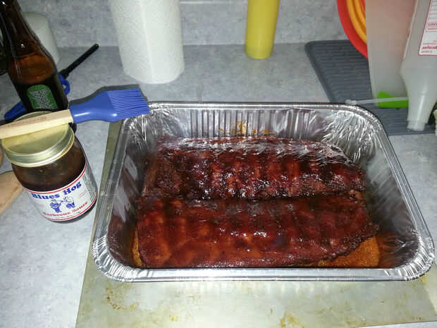Después de 1 hora, retire las costillas y retire el papel de aluminio. Salsa de las costillas con la salsa de su elección y volver a sellar el papel de aluminio sobre la bandeja. Cocinar las costillas durante 30-60 minutos más dependiendo de lo tierna desea las costillas al ser.