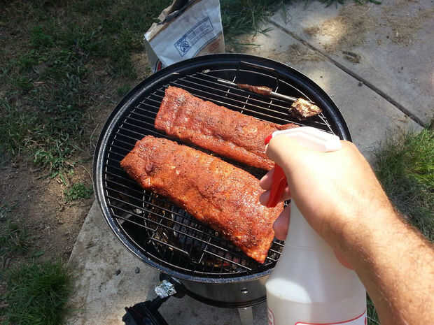 Después de las 2 horas, retire las costillas del fumador y el lugar en una cacerola de aluminio. Crumble de azúcar morena encima de las costillas (~1/3 taza por losa) y rociar con miel (dos cucharadas de cada uno). Luego Vierta 1 taza de jugo de manzana (mina calor hasta la temperatura ambiente en el microondas) en la parte inferior de la bandeja. Cubrir bien el molde con papel de aluminio. En este punto las costillas han absorbido bastante humo y queremos mantener el resto. Lo siento no hay foto de este paso. Coloque la bandeja de aluminio en el fumador durante 1 hora.