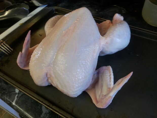 Comenzar con el pollo. Retire cualquier mollejas; Dar un enjuague y secarlos con papel absorbente, dejar reposar en el contador.