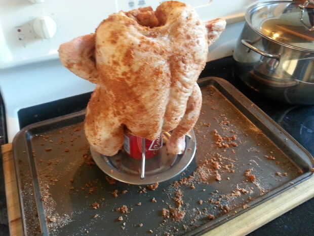 Introduzca la lata en el pollo y las patas para sostener como un taburete. Empate de nuevo las alas, o solo abdomen ellos nuevo (como hice yo en la foto) dirígete a ti fumador / barbacoa.