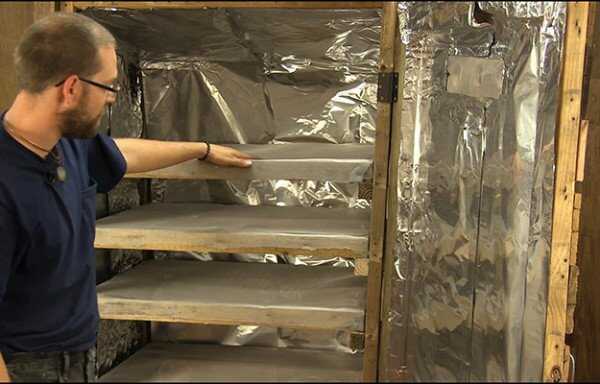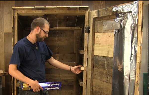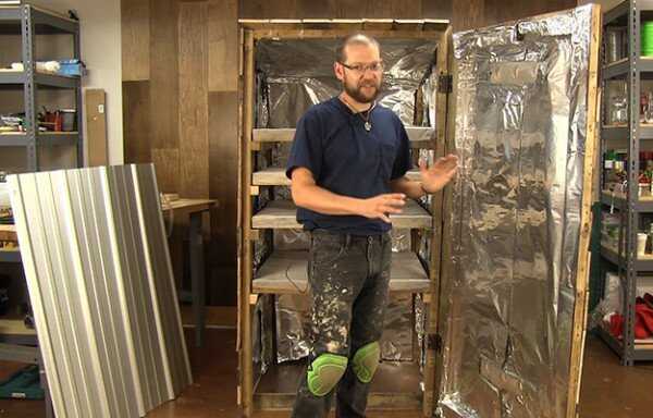 La línea interior de la casa de humo con papel de aluminio resistente. Hacer que la estructura como el aire apretado como sea posible. Vaya a utilizar 2 o 3 rollos de papel de aluminio. Utilice una pistola de grapas para sujetar el papel para las paredes.