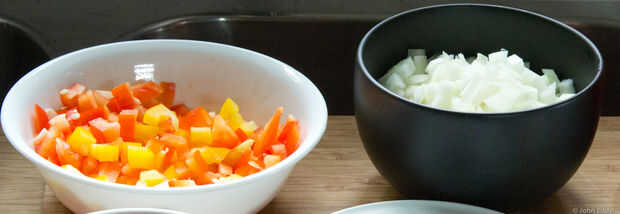 Picar un pimiento rojo grande (o mitad rojo y mitad de un pimiento amarillo) y una cebolla grande. Picar un pimiento chipotle ahumado (seca o fresca). Si no encuentras chiles chipotles secos, puede comprar una lata de chiles en salsa de adobo y utilizar una pimienta de la lata. Estos irá en el bote a la vez, así que puedes combinarlos en un plato único si desea.