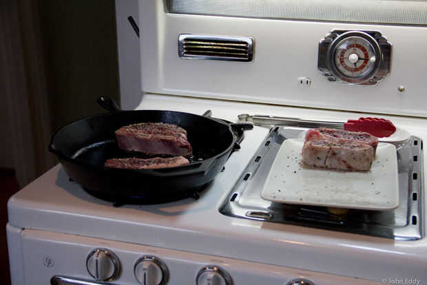 Ahora que todos sus ingredientes están en su lugar, calentar una sartén de hierro fundido a fuego alto. Añadir dos cucharadas de aceite o manteca de cerdo a la cacerola y llevar a la temperatura.