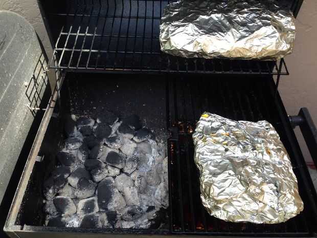 Retroceder a la parrilla y cocine por una hora adicional. En este punto, no tiene sentido continuar quemando madera. Interruptor para terrones de carbón porque el fumar se hace una vez que Envuelva en papel de aluminio. El método de papel de aluminio se conoce por algunos como "la muleta de Texas". Esto se hace para evitar la evaporación superficial de la carne. Antes y después de envolver, evaporación enfría la carne, y es lo que es responsable del infame "atascamiento" un período de varias horas donde la temperatura interna de carne mesetas. Con la muleta, la carne acabados de cocinar más rápido.